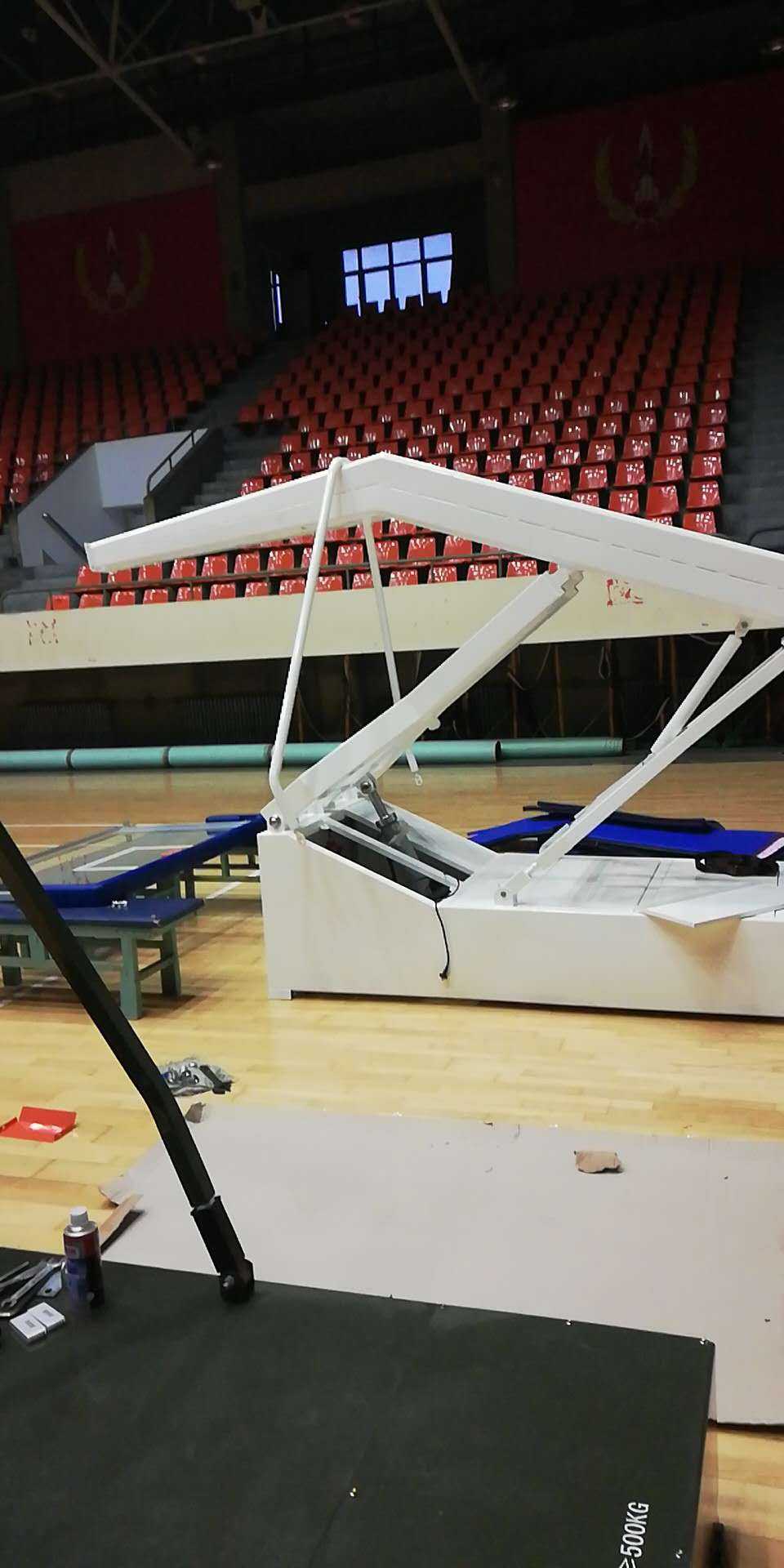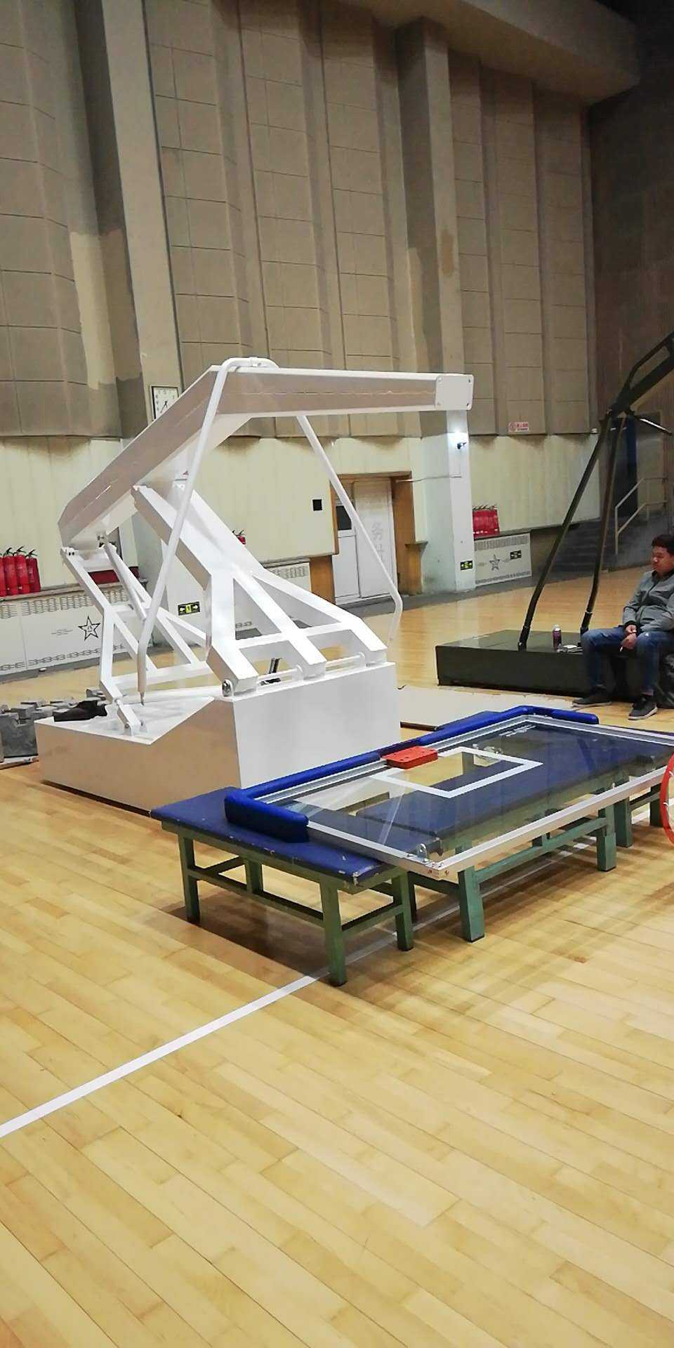 北京海淀區(qū)體育館定制的電動(dòng)液壓籃球架現(xiàn)場安裝調(diào)試中